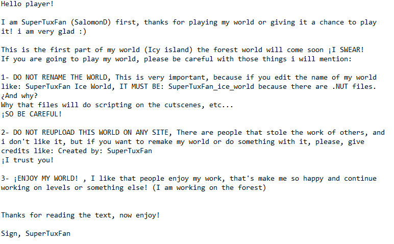 The other thing, that yes that i say, can i was not SO inspired of the forest, but i'm trying to put a part that is not related to the story mode, but i cant, i dont have ideas to put something on the level, so i see the story mode and that give's me some "Ideas". Appart one thing that i want to say is that i want to be a good SuperTux level creator guiding me on the levels of other experienced ST Creators.
