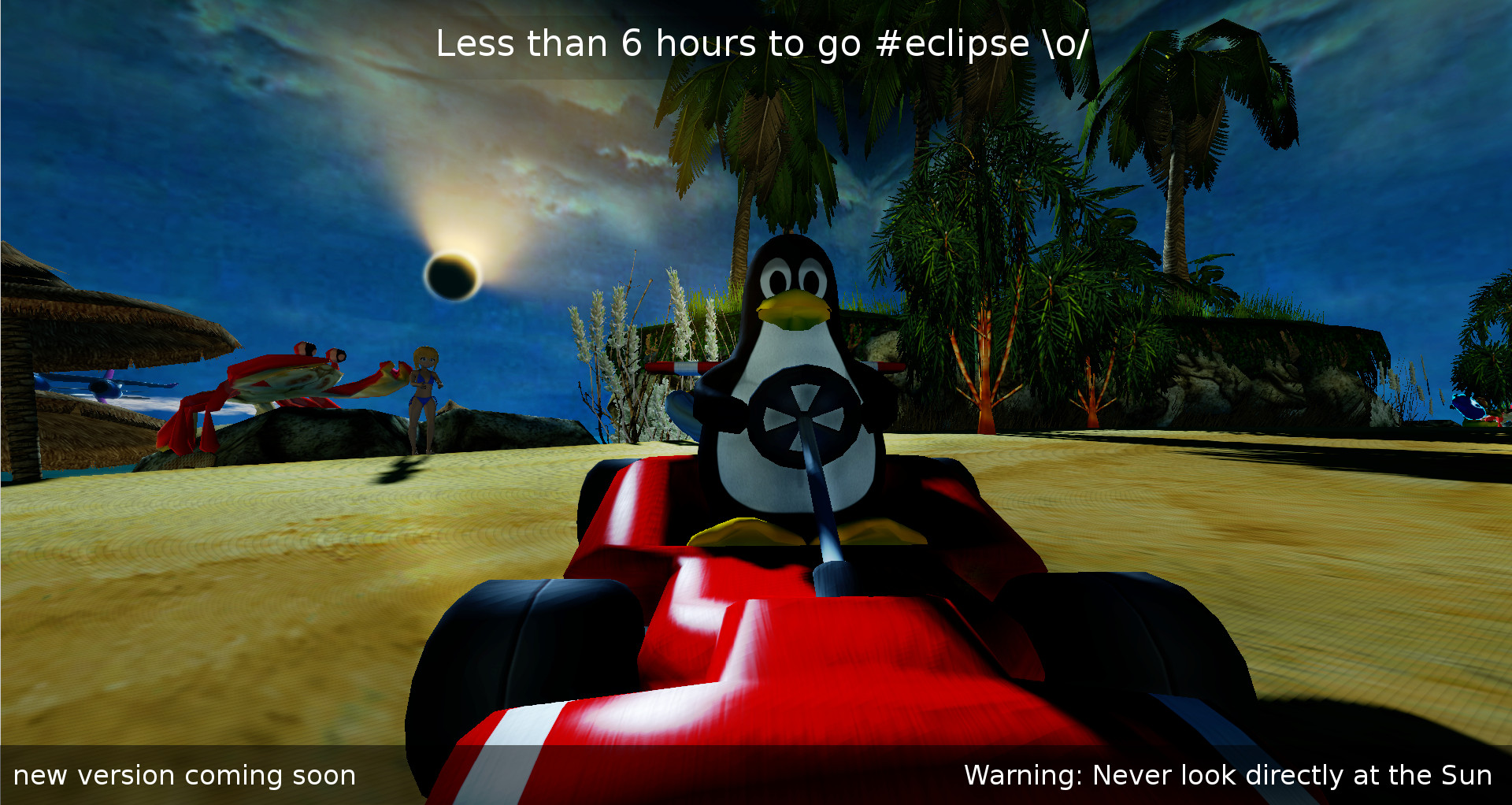 Many people asked if a day/night cycle was possible in supertuxkart. While this is not possible currently, I have made a quick test to see how difficult it would be to switch a track from a day situation to a night one. I did this quick and dirty test in less than 2h for the European 2015 eclipse.