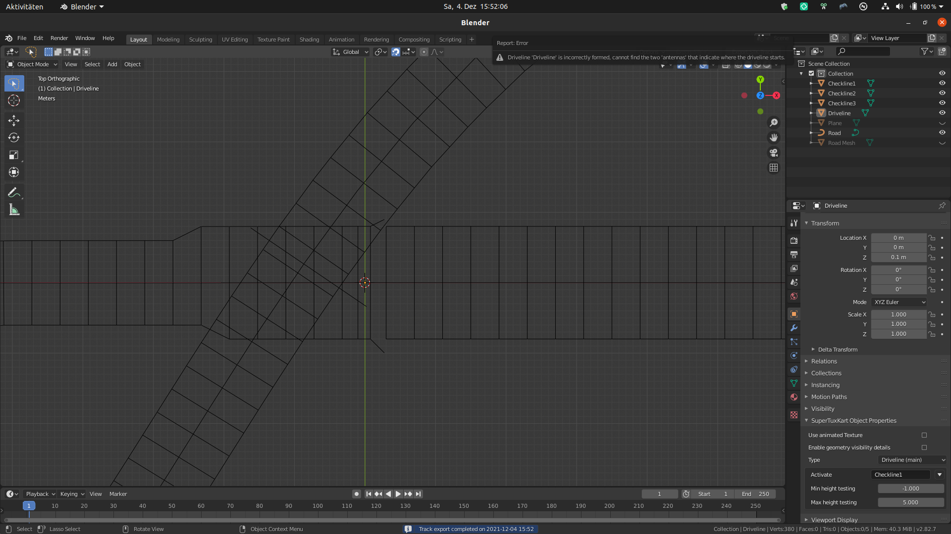 I'm trying to make my first SuperTuxKart Map. When exporting the map Blender tells me the "Antennas" (shown here: https://supertuxkart.net/Making_Tracks: ... start_line) on the driveline are missing, even though they are there. At the same time a success message appearas. I can't find the track so it most likely didn't succeed at all.