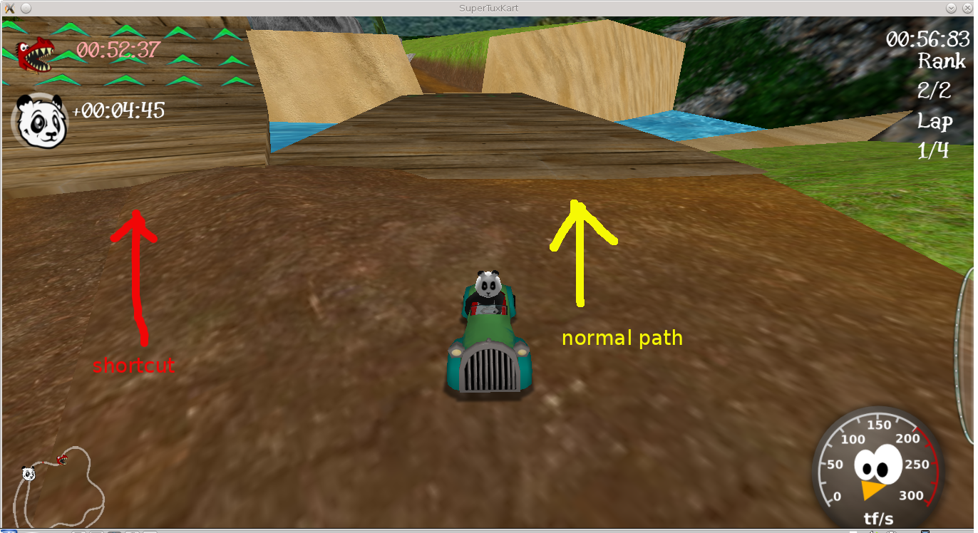 on this track after crossing the bridge will have two branches, if you use the right lane so the finish will be right in place, but if you use the left lane then the finish line will be faster according to the picture I sent, so we can finish first