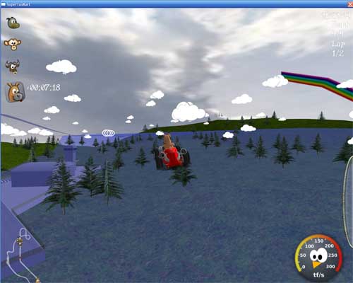 This track has been evolving an awful lot over the last few days. Before i give another version for everyone to try i'd like to solve some bugs in it. As you can see in the screenshot the trees (which are 2 2d images) draw right through the blue-transparent track. Both are alphablended, what would be the right thing to set them to? The clouds have the same problem as well but aren't nearly as bad as the trees. Also, i've added a rainbow and unfortunately it's cut off because it's too far away, could i make it so that this doesn't happen?