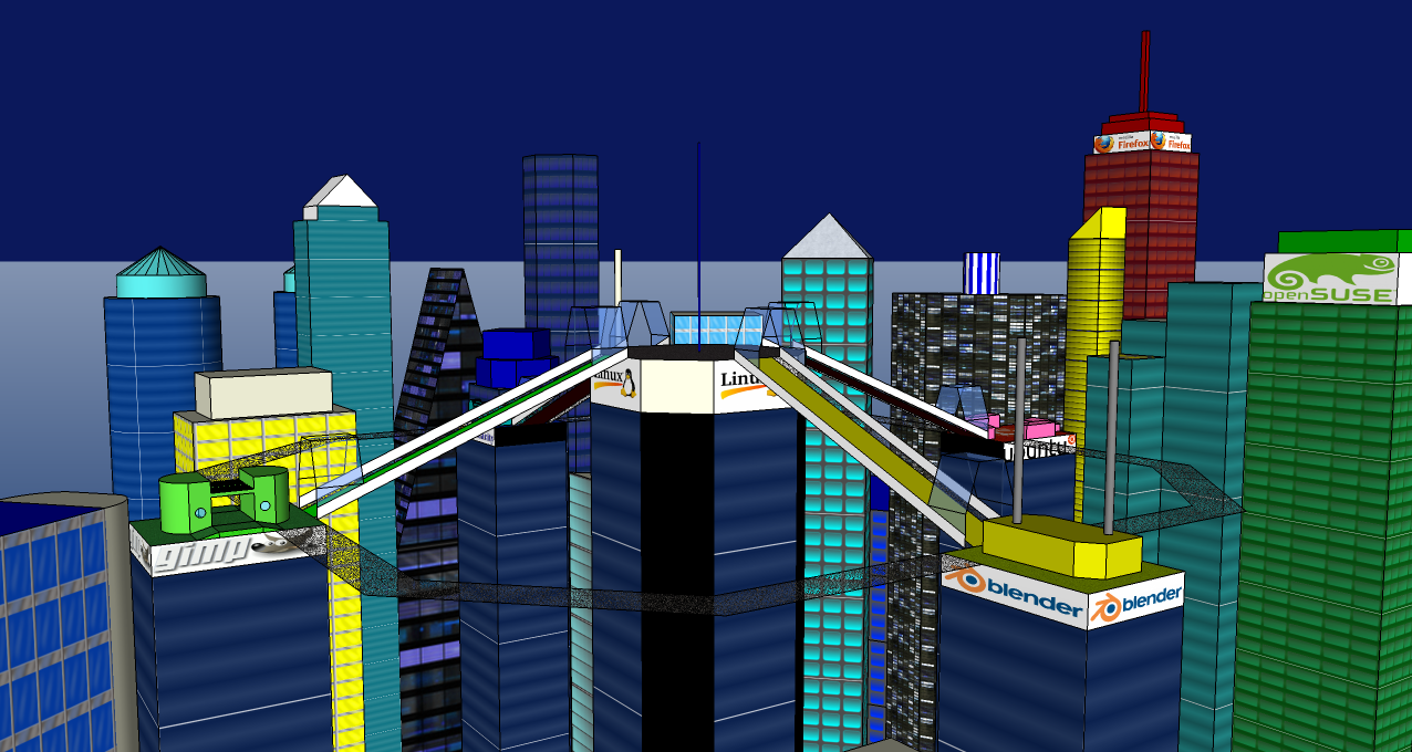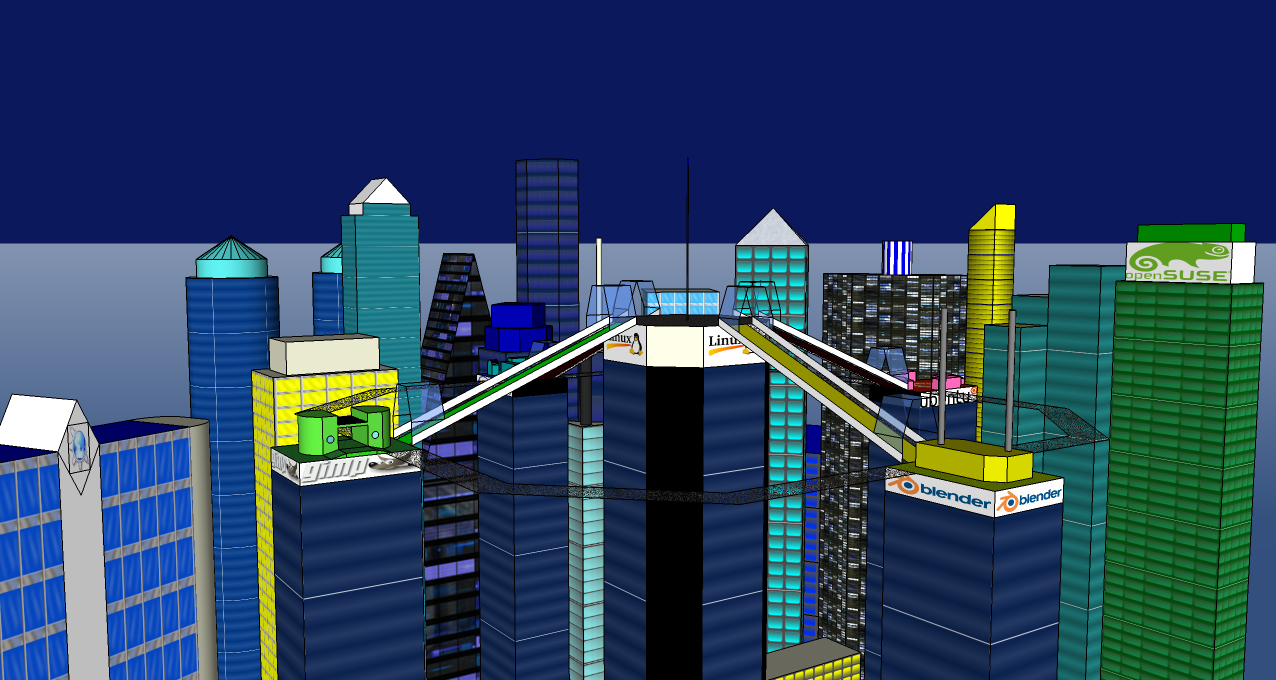 Here's the 6th preview of the city arena. I added 4 new towers like the OpenSUSE Building and the Konqeror office building. The picture was expanded to see the new buildings.
