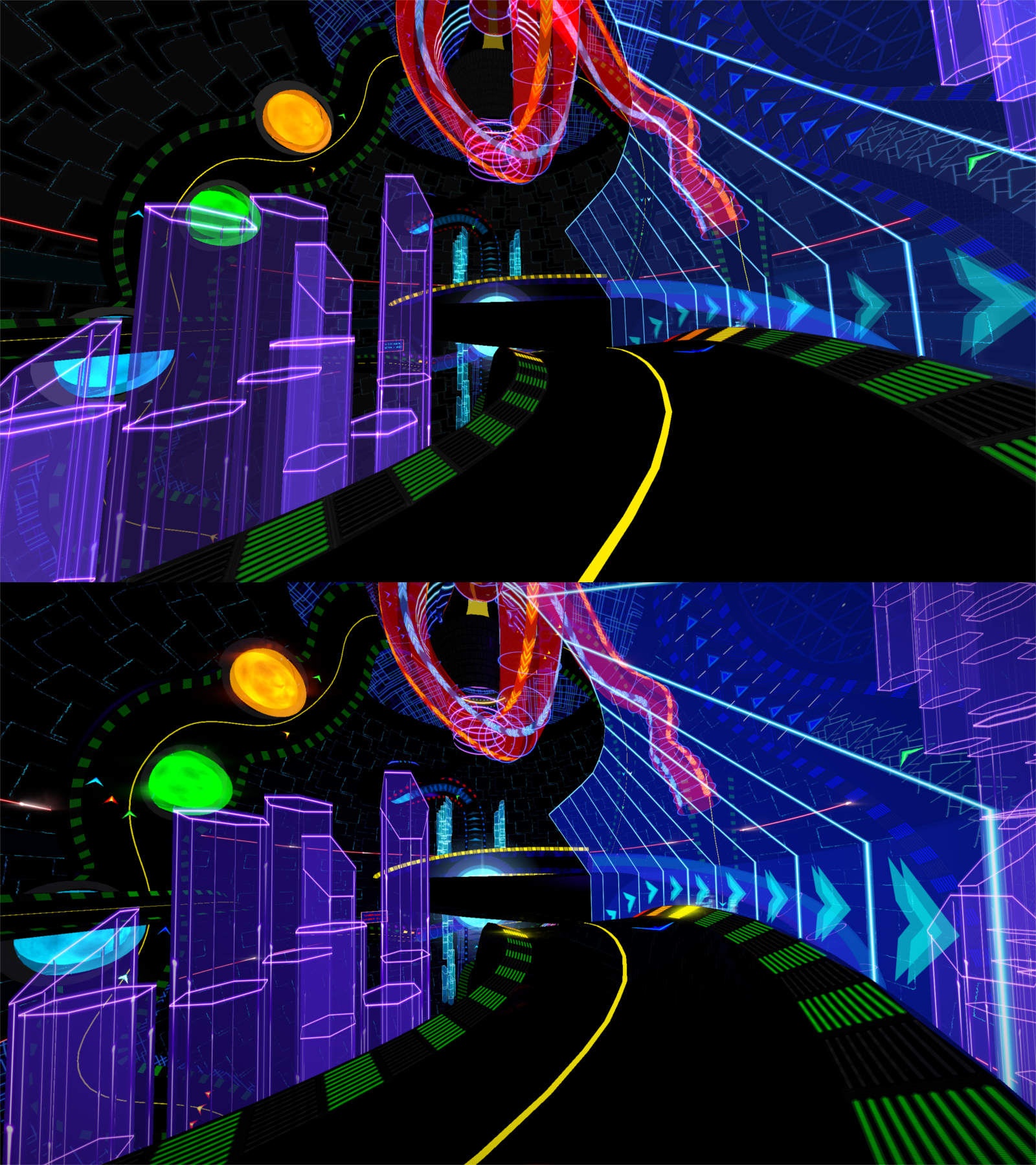 - A dark but colorful design that uses lighting, lots of PBR effects (mostly glow and reflections) and some particle effects (like a burning banana field). It was important for me to make the track look good with and without improved graphics. The following picture shows a screenshot made with the lowest graphics setting (top) and another one at the same view that was done with improved graphics activated (bottom).