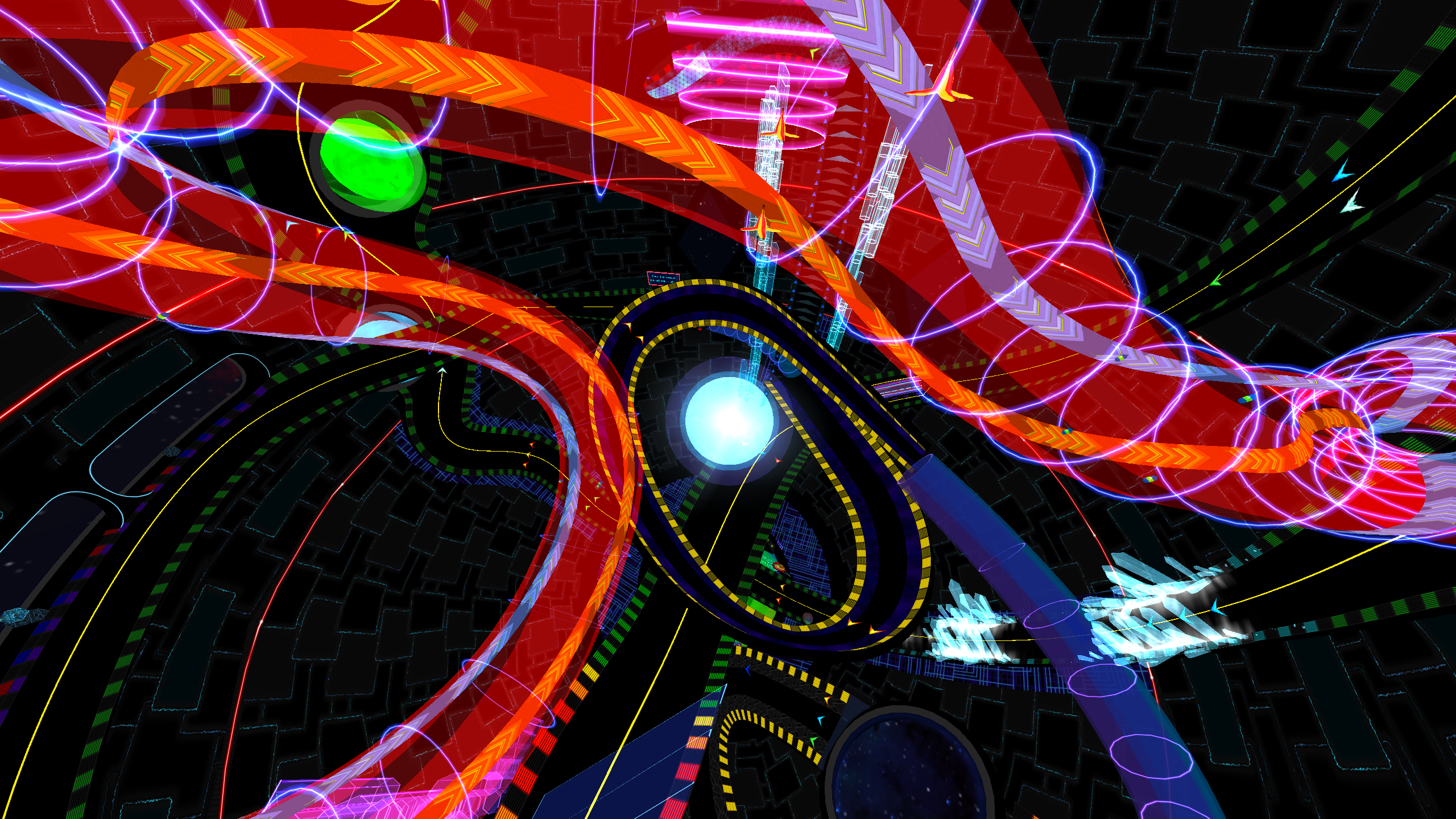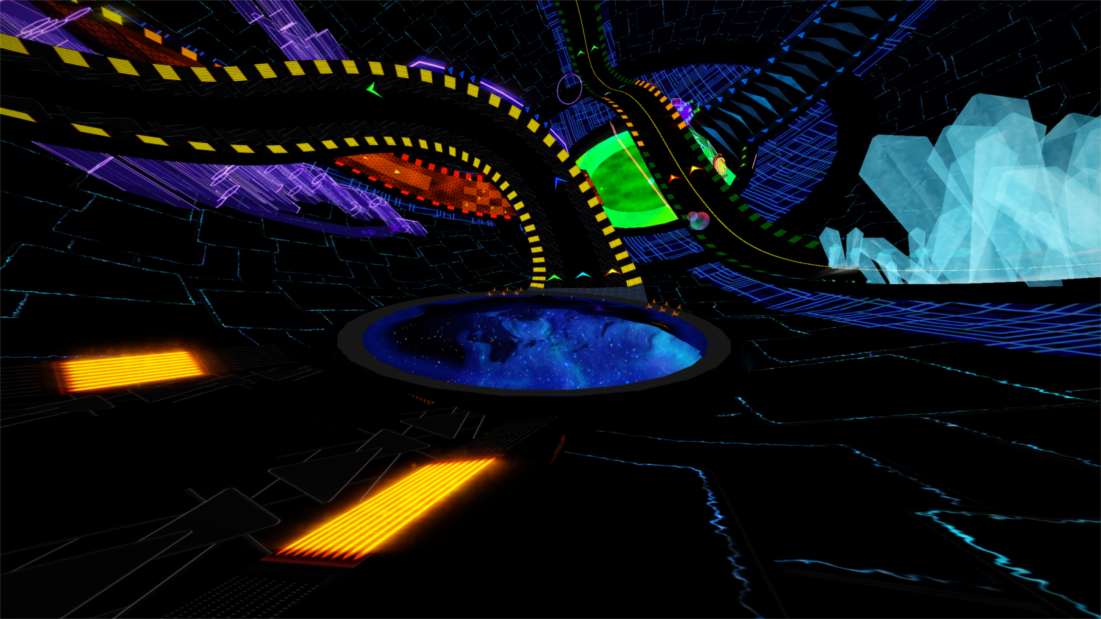 - Three big sphere with different behaviors if you hit them. The blue sphere shocks the player, the green one bounces you away, the orange one pulls you inside and then shoots you into the central sphere star.