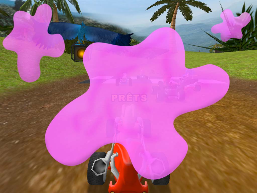 S@f {l Wrote}:- When the Bubblegum pops, have the other karts, who are in a short range of the kart with the Bubblegum, some pinky gum splats on their head :D ? If it's possible, the view of the player can be also block by some gum splats, like in the picture below.