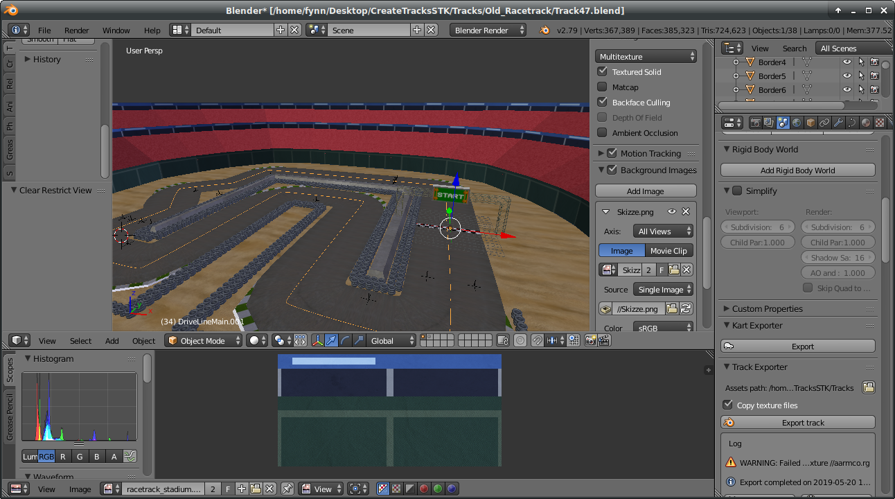 • Scale all objects in the original track by 1.5 Blender units. This also has the effect of making the track wider.