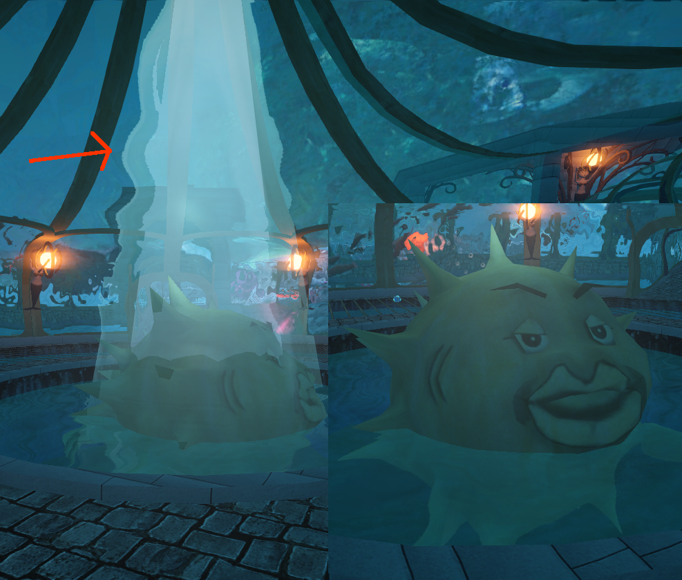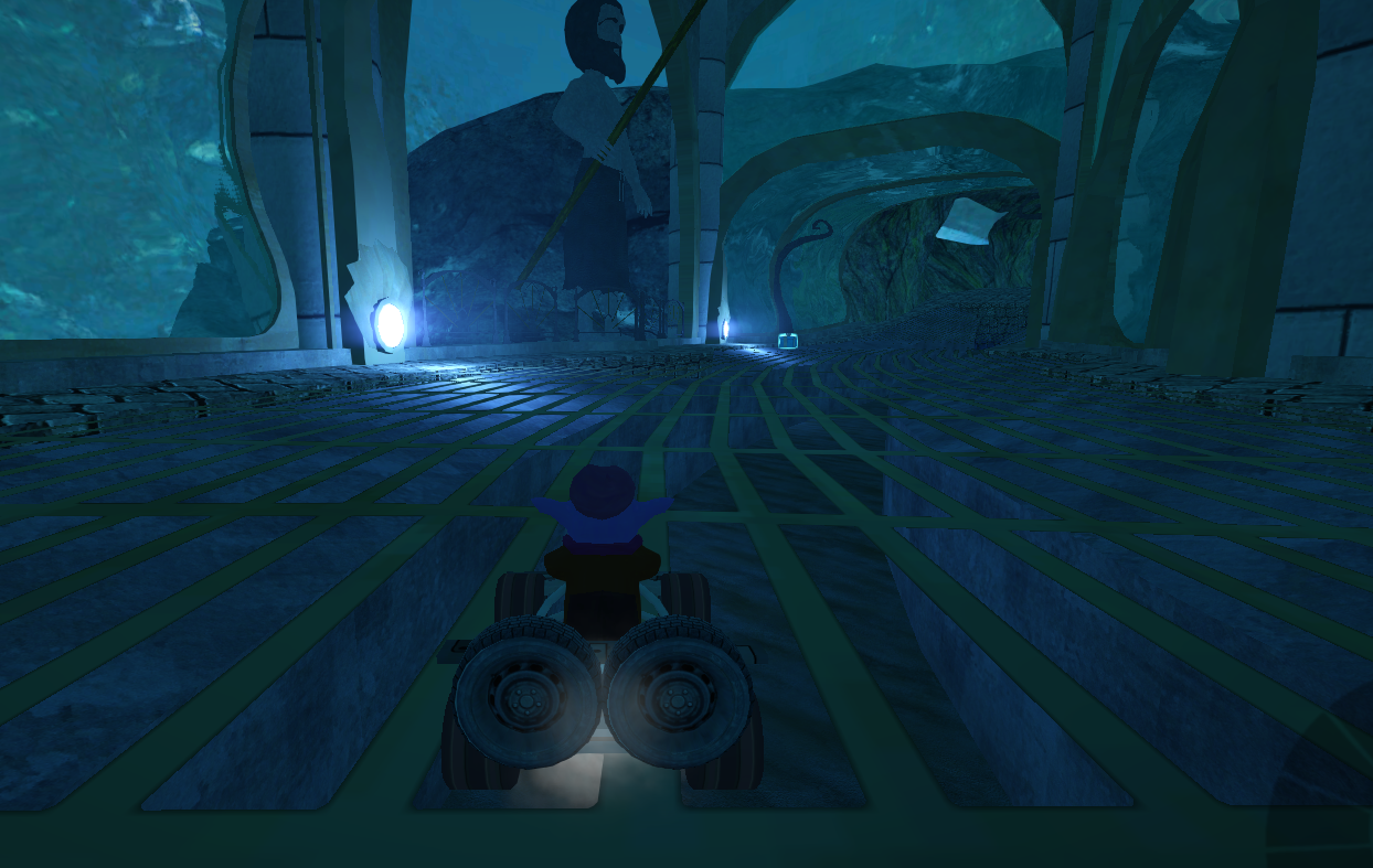 I experimented with lighting the puffy statue. I added a light cone (like in the lighthouse track), but the mesh gets displaced by the water shader behind that.
