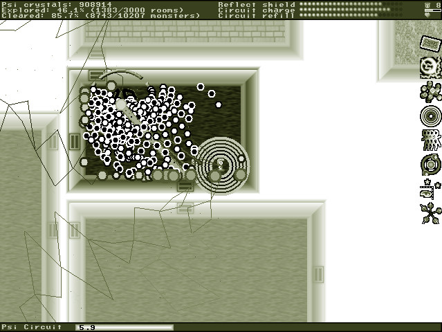 You play as Merit, a psi user, who got himself into the Orcus Dome. The Orcus Dome is a large system of 3000 interconnected rooms. The room system is randomly created each time the game is started. Strange shadowly creatures crawl around the Dome and threaten Merit. Merit can use his psi powers to release a powerful discharge which, when strong and close enough, destroys or hurts the shadow creatures. Merit’s psi power can also be used for a reflector shield which reflects incoming enemy bullets. Destroyed enemies drop psi crystals which can be used to upgrade the psi powers. As you progress in the game, all monsters will become more difficult to defeat and more aggressive.