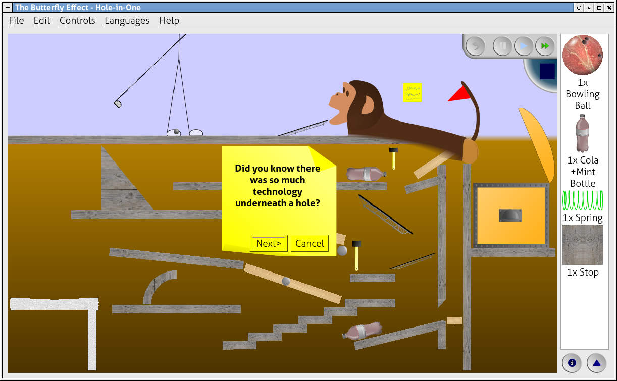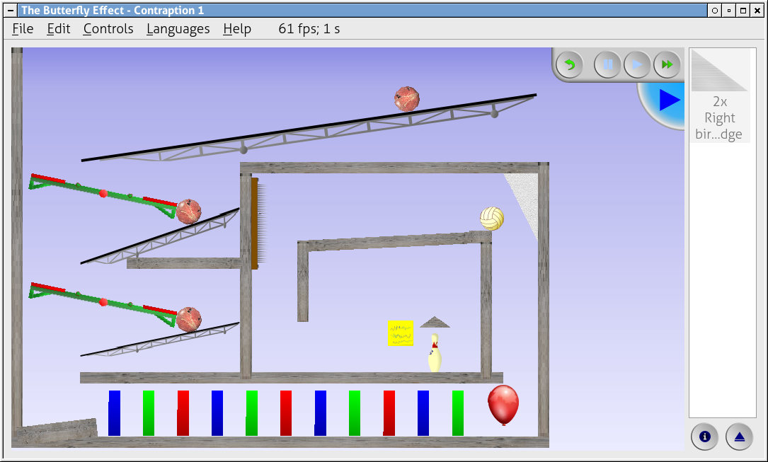 You have several objects to build your contraptions, such as ramps, levers, walls, wedges, balls, bowling pins, balloons, cacti, cola bottles with mint (they blast off if you nudge them), penguins, butterflies (of course!), springs, remotely-detonated dynamite, and a few more.