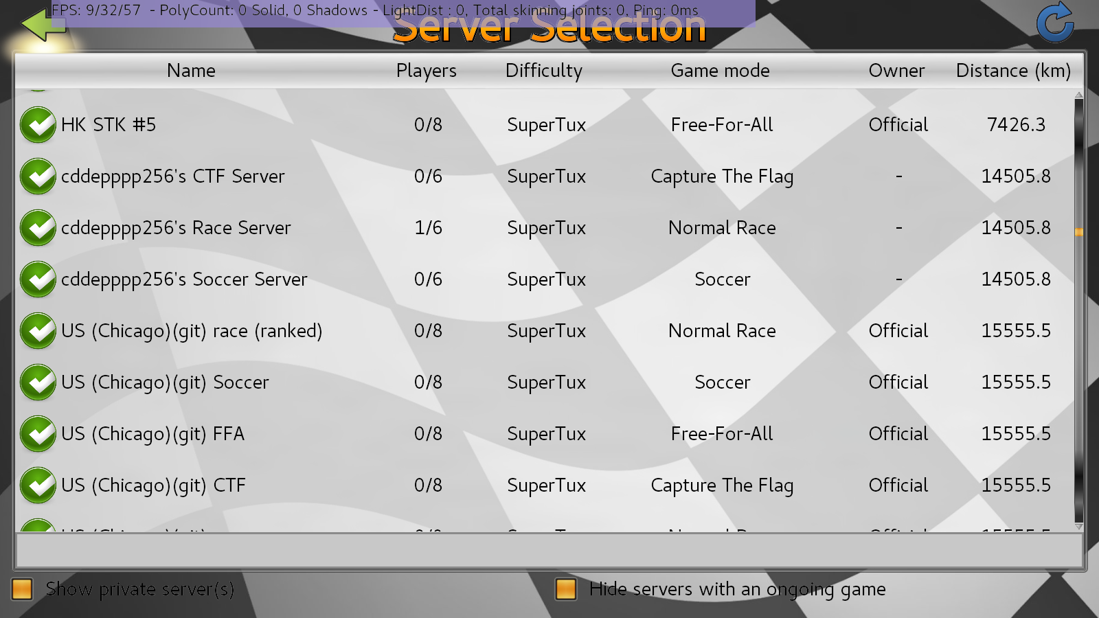 nearly one year after the 0.9.3 release we are getting ready for the next release of SuperTuxKart. And as many might know, we have actually been very busy working on the network implementation to allow online races. As expected, this has taken a lot of time, but we have finally reached a stage that we need more testing. For now we call this an alpha test, since there are still some known bugs and some polishing is required as well, but nothing that should affect the actual network race at this stage. De facto, we have been doing alpha tests with visitors on our IRC channel for some weeks now, have a look at some of the servers up and running: