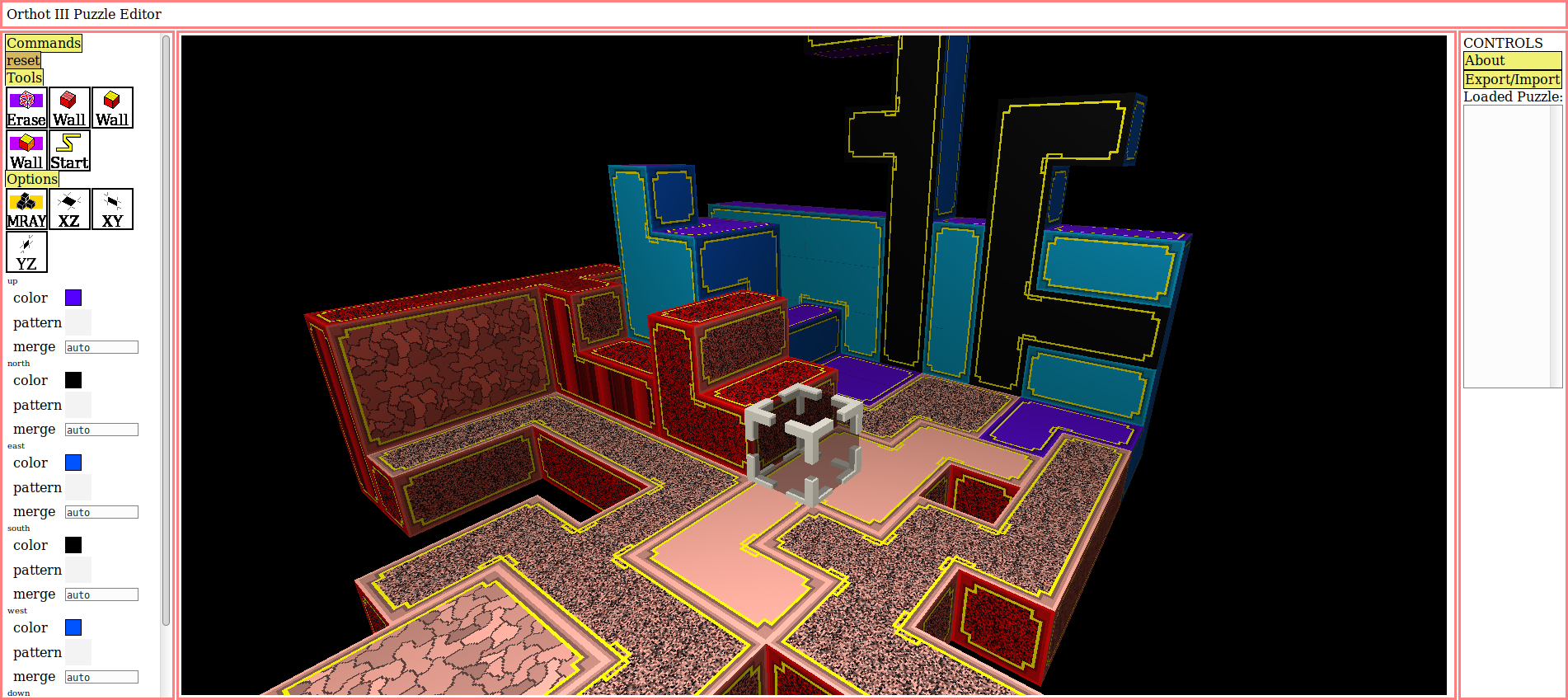 The new puzzle editor is now up and running, and has been merged into the main branch. Some aspects of it are a bit underdeveloped. As usual, the most recent parts of it have only been lightly tested (mainly the editor configuration file and data import to Orthot), but it seems to be in order. The editor is linked from the Orthot interface (though the above link has not been changed). Instructions and a few hints about puzzle element customization are accessible in-editor.