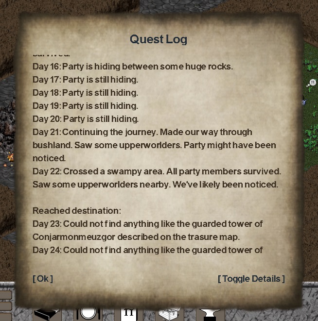 Next step - a quest processor, which calculates the outcome of a raid. It takes a party and the quest description as base for the simulation. The only thing that is really implemented at this point is the overworld awareness of the party. Once they have been spotted they are more likely to be ambushed the following day, and battles are even more likely to be noticed again. So things get increasingly worse once the party ran into fights.