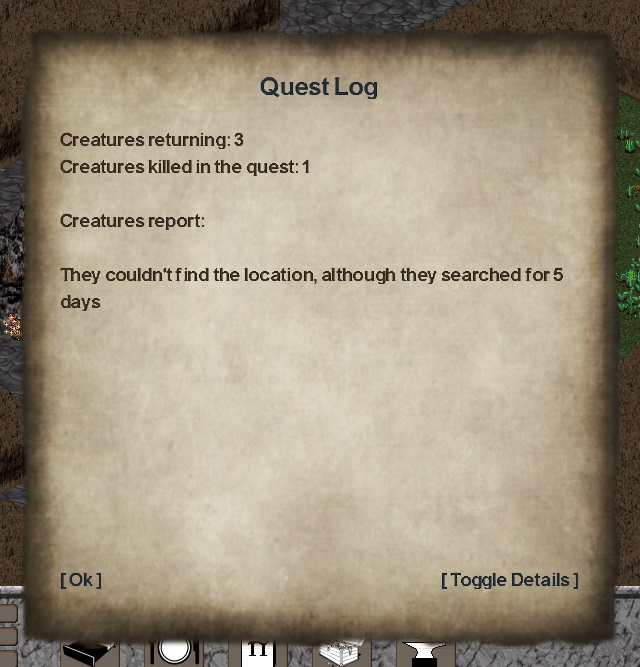 Slowly getting there with the quest thing ... still missing are guarded locations/buildings and the actual treasure calculation, but the creatures now are able to identify locations: