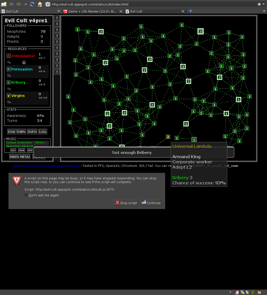 > Script: http://evil-cult.appspot.com/static/cult/cult.js:2685 sometimes freezes firefox and I have to stop it.