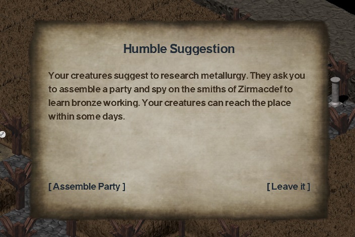 One of your bookworms suggests that you send creatures to gather intelligence about bronze working form the smiths of Blackmannon, to create weapons and armor for your fighters.