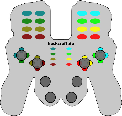 Virtual Gamepad with button groupings for individual thumbs and fingers - colored for holding ergonomic holdability constrains (source)