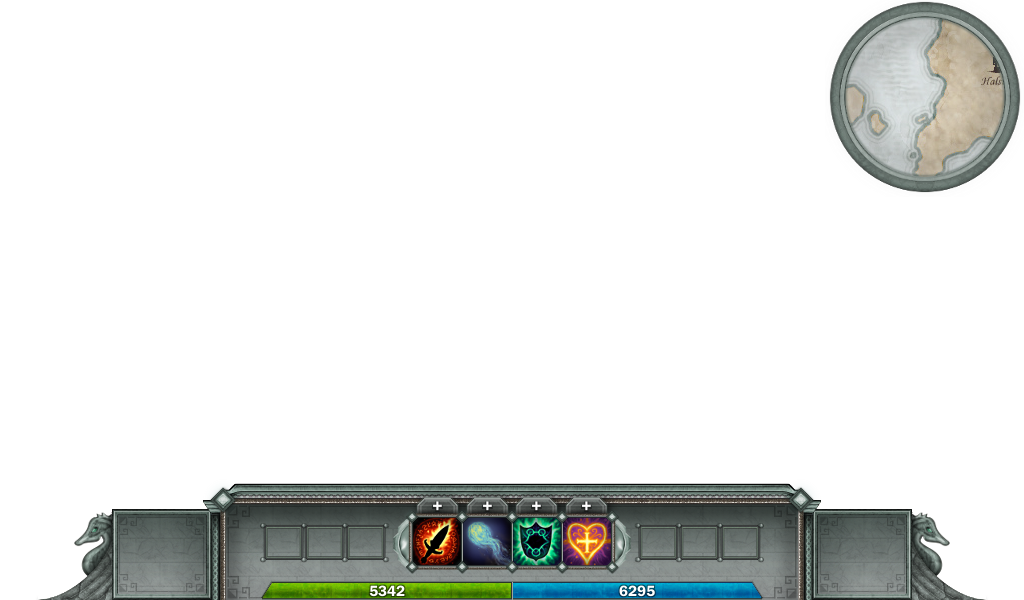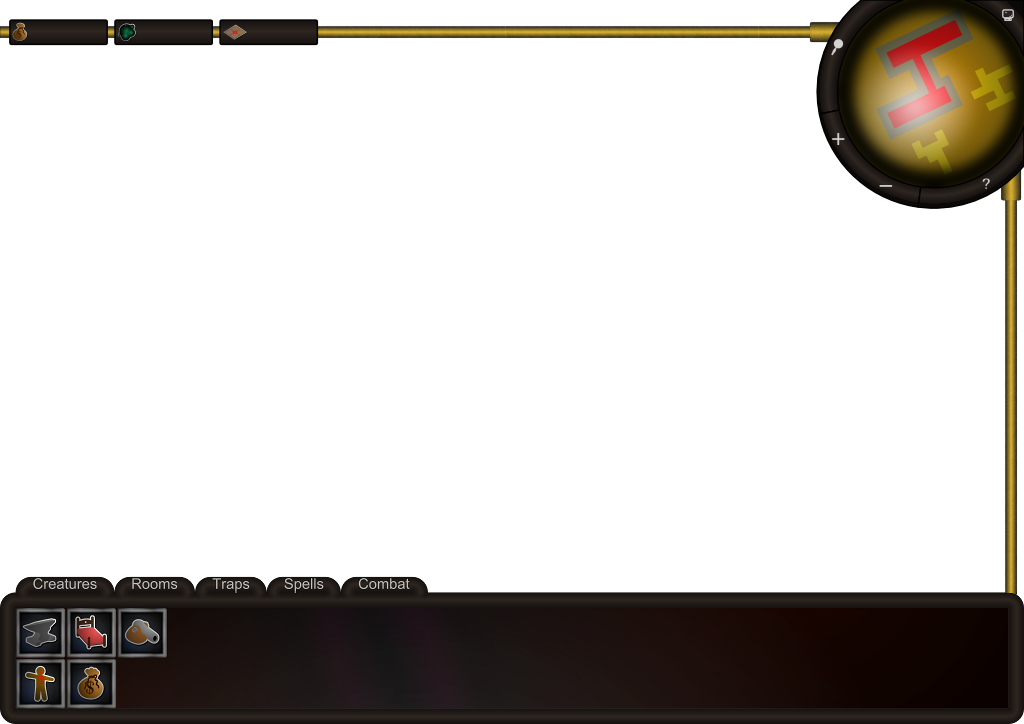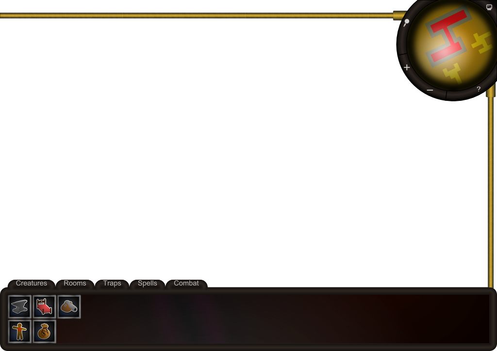 andrewbuck {l Wrote}:That looks very nice, it makes very good use of the screenspace. The two square things on the side could be used to switch what is displayed in the three squares on that side. So, for example the left side could be divided into 4 squares, one each for creatures, combat, rooms, and traps. Depending on what you select you will see different things in the three squares on that side. The right side would work the same; this way you could display any two sets of buttons at a time.