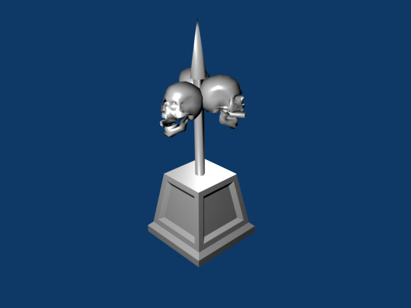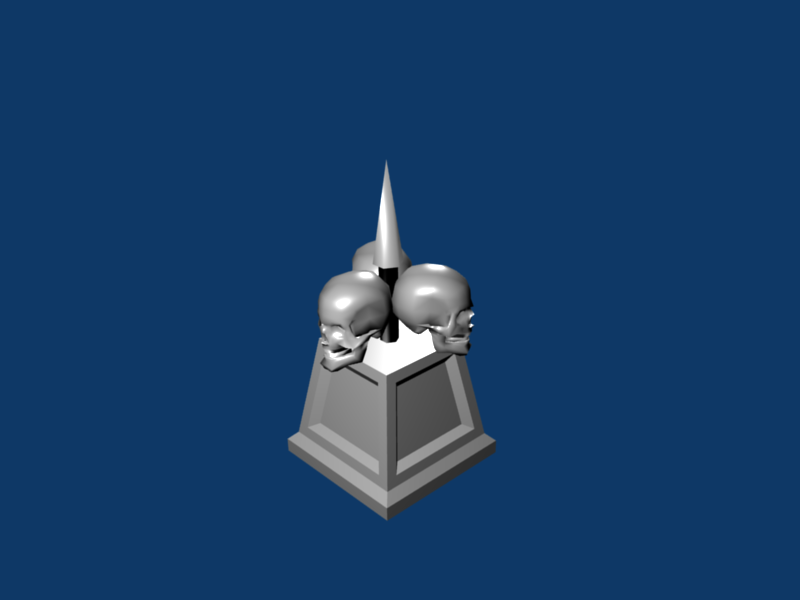 After a total a lack of inspiration i finally had an evil revelation, see here the WIP poison trap; The pedestal will be black marble with green veins, the squares on the side will have engravings (need ideas about what to depict, maybe death-themed with the grim reaper...), The idea is that once an enemy gets near, the central rod (would an spear like tip be better?) elevates and start spinning, the skulls open their mouths from which a tube appears and begins to "spit" poison gas all around.