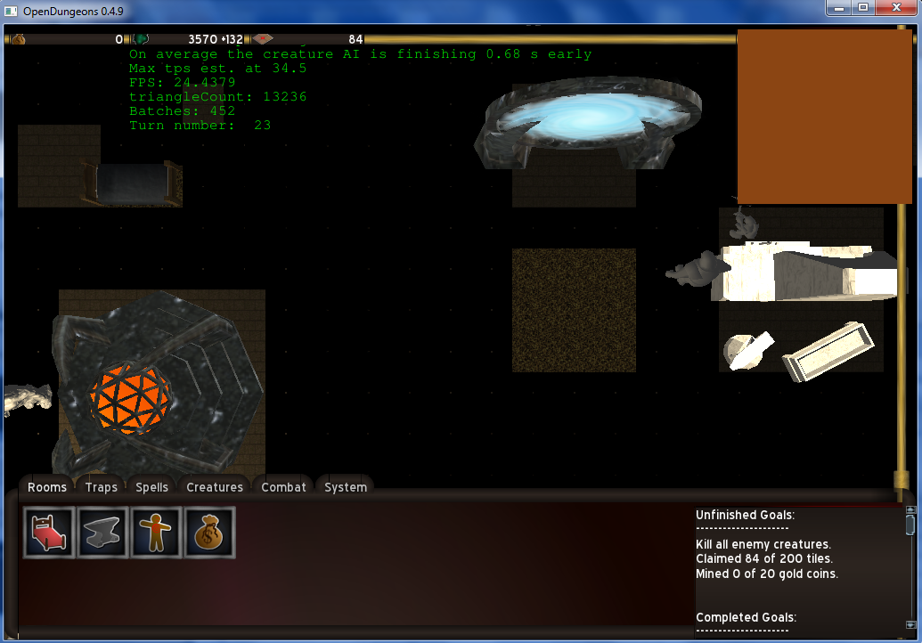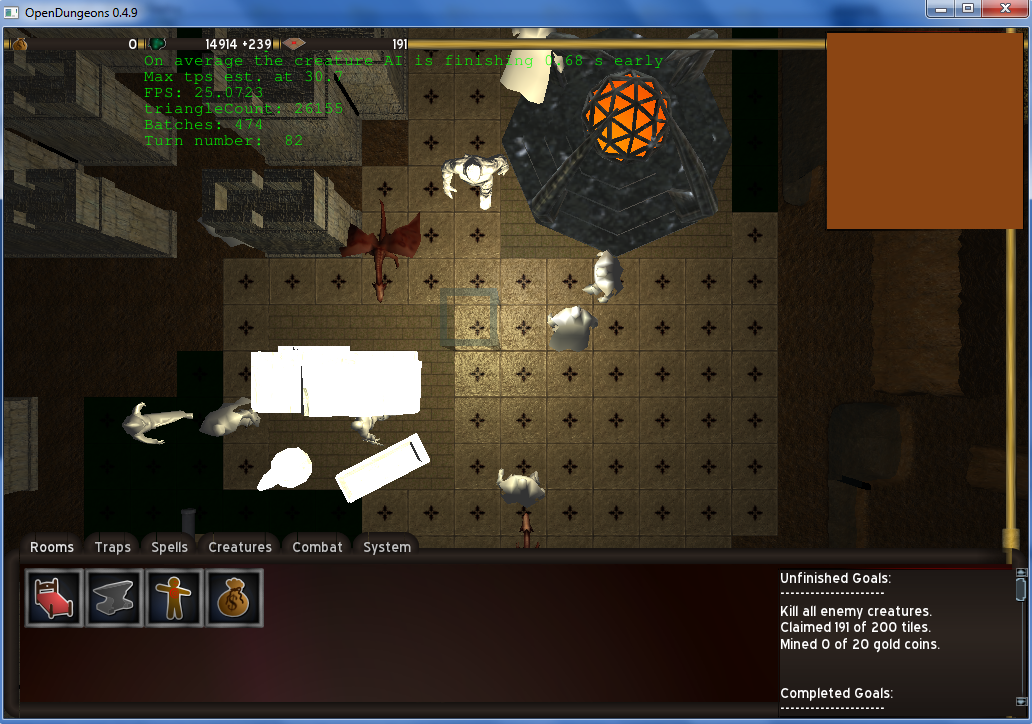 - The mouse is working and I can grab creatures, yet, the wall selection rectangle is behaving weirdly (not always appearing). I don't know whether it's because of the current field of view.