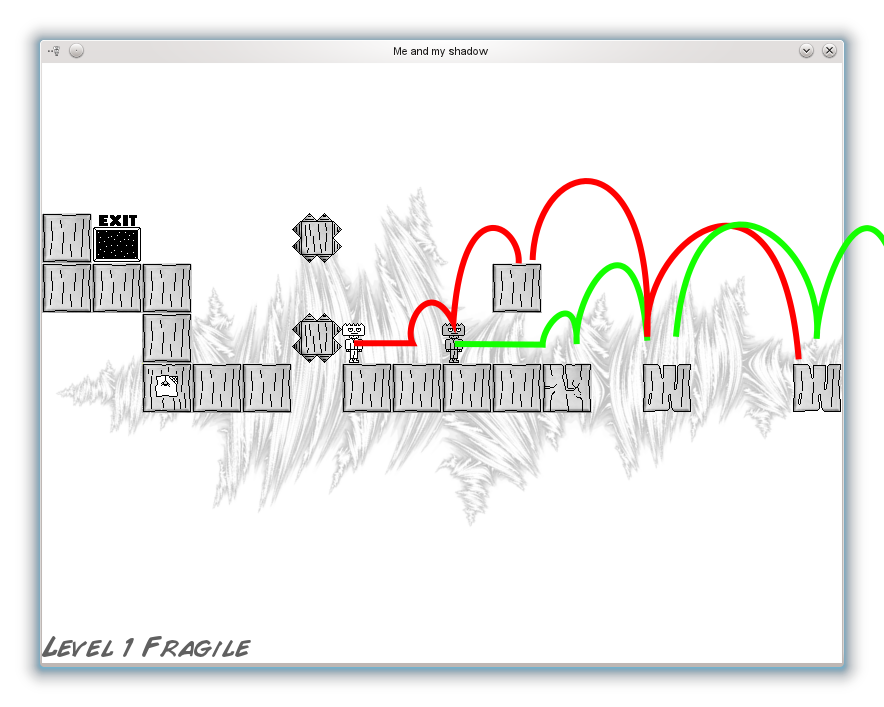 acme_pjz {l Wrote}:And I don't know how to get through your modified "Fragile" level :| Finally, I make use of the bug in game: if you stand on the shadow and press Space+Up+Space quickly then you'll standing on the shadow while the shadow is in air ... and then press Up key then you can jump :| I'm considering if I should fix this bug or leave it as a hidden feature?