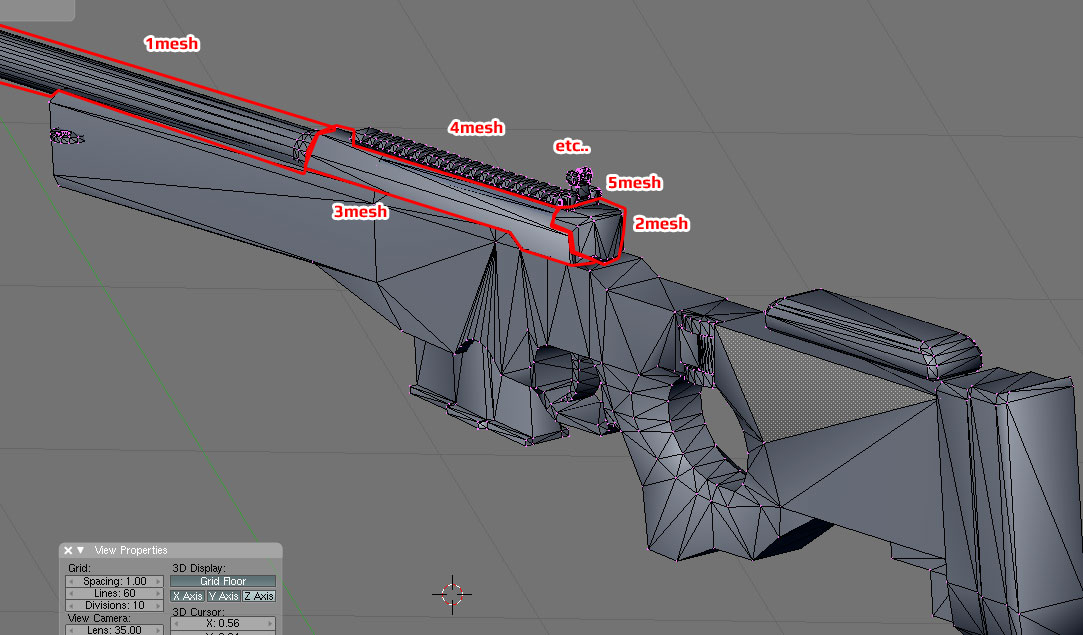 You can watch the screen of the cube2 rifle, each separated part is a separated mesh (linked file)