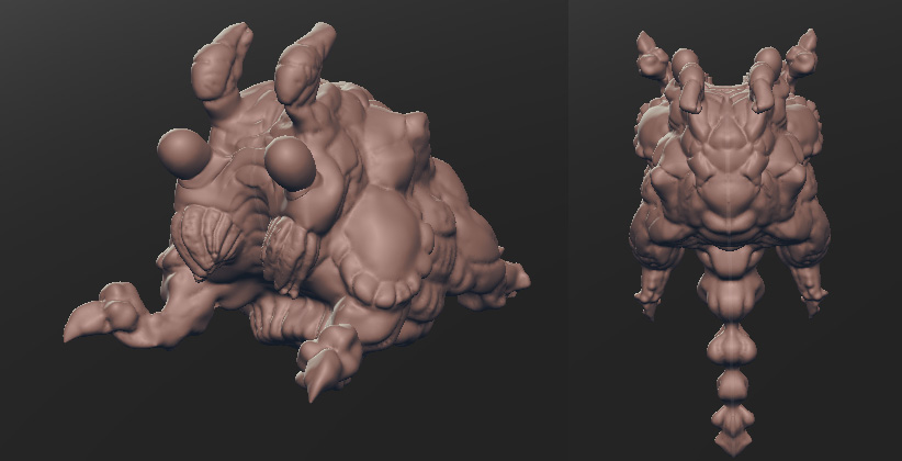 I made a ugly, little, crawling monster for testing purposes (I hope you're disgusted :D ) and a human head which I modelled in about 15 min without reference (it still needs some work):
