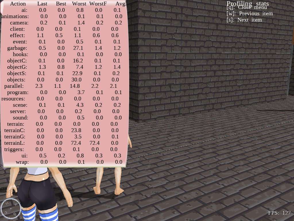 There is a basic high level profiling tool already in the game. This just gives you how many milliseconds in spends in each section of the main loop, and some other sections. To use this press "T" to bring up the chat input window, and then type "/prof" to bring up a text widget thing which shows the table of stats. You can reset the gathered stats by using the command "/prof_reset".