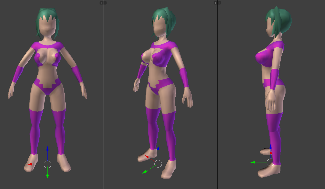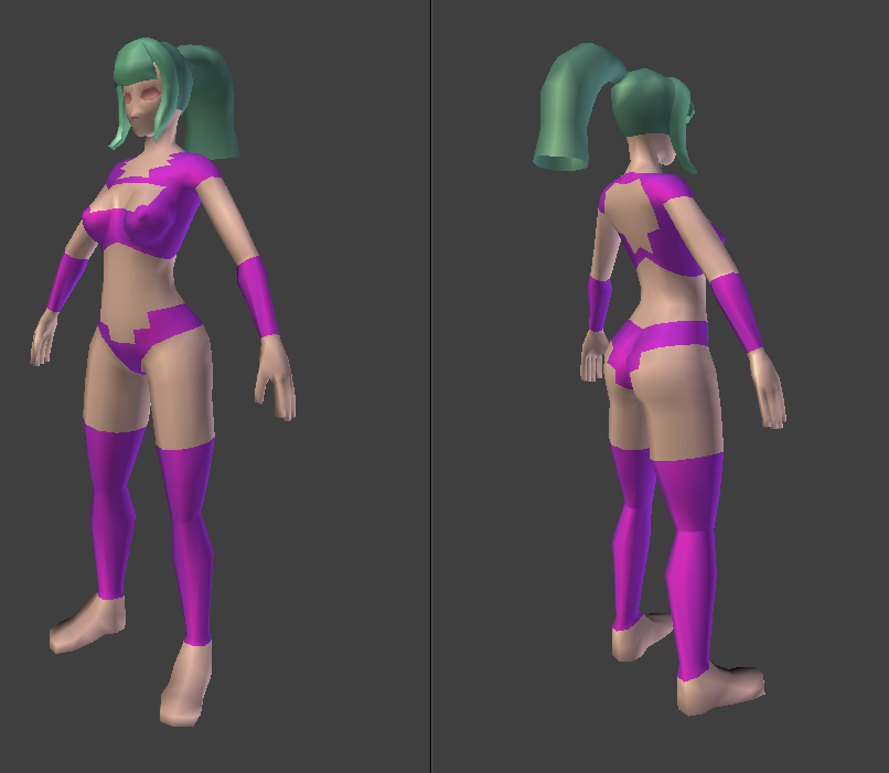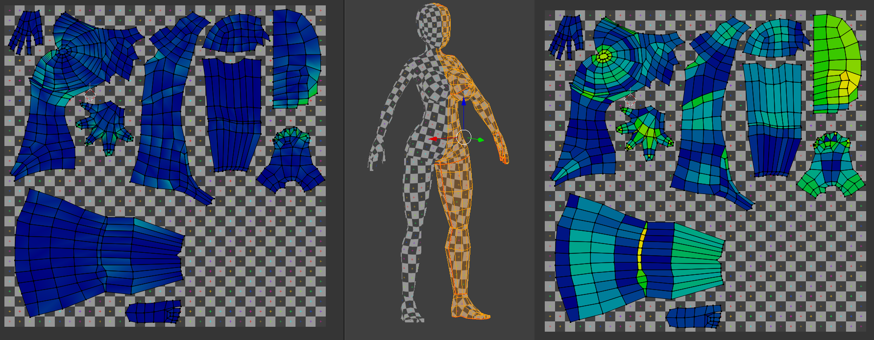 Because creating equipment involves a lot of texture painting, the quality of the UV layout is quite critical too. Both distortion (more important) and the number of seams (less important) should be minimized to make painting easy, and the layout should be mirrored over the X axis since it typically halves the painting work. The UV layout should also try to balance the needs of the shape keys so that none of them cause too much stretch. Furthermore, there should be a little (~10%) empty space allocated for extra polygons that underwear or various small attachments will need.