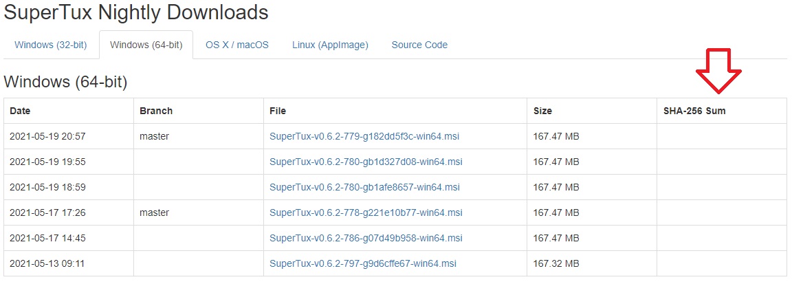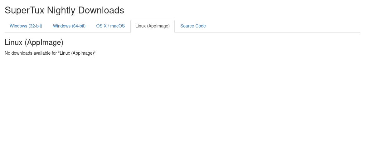 http://download.supertuxproject.org/download/Please note:These snapshots are rather recent developer versions that might potentially contain severe bugs and untested features. You're using these at your own risk! We (The SuperTux team) are not responsible for any damages to your computer, your hard drive, your cat, your lawn mower or your sanity!