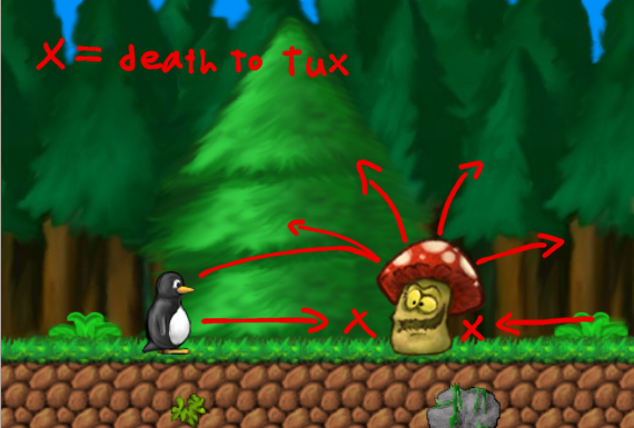 Or maybe a little sprout, that will walk back and forth. And if you get close enough to it, the sprout will stop, and shoot peddles out of it, aiming right at Tux.