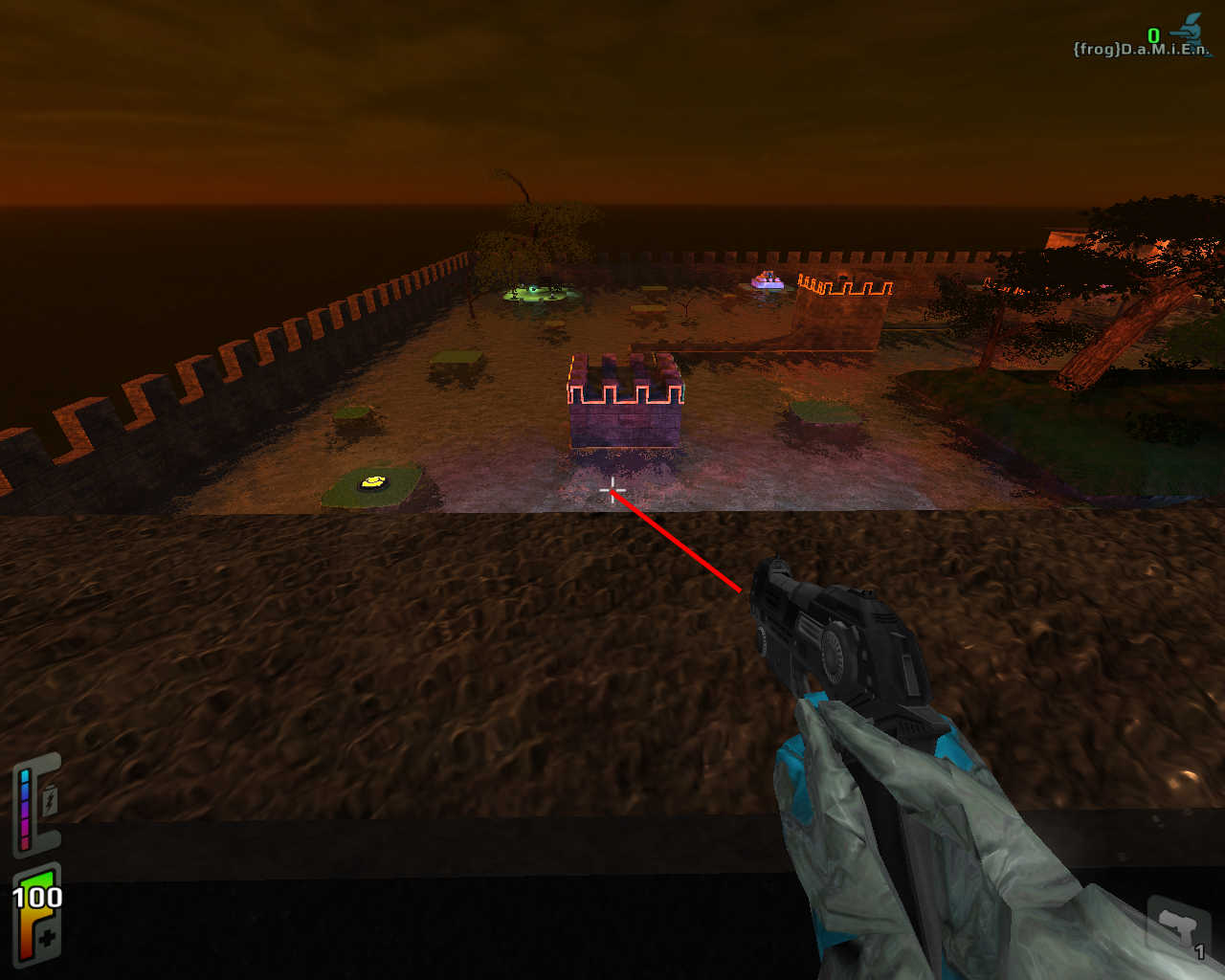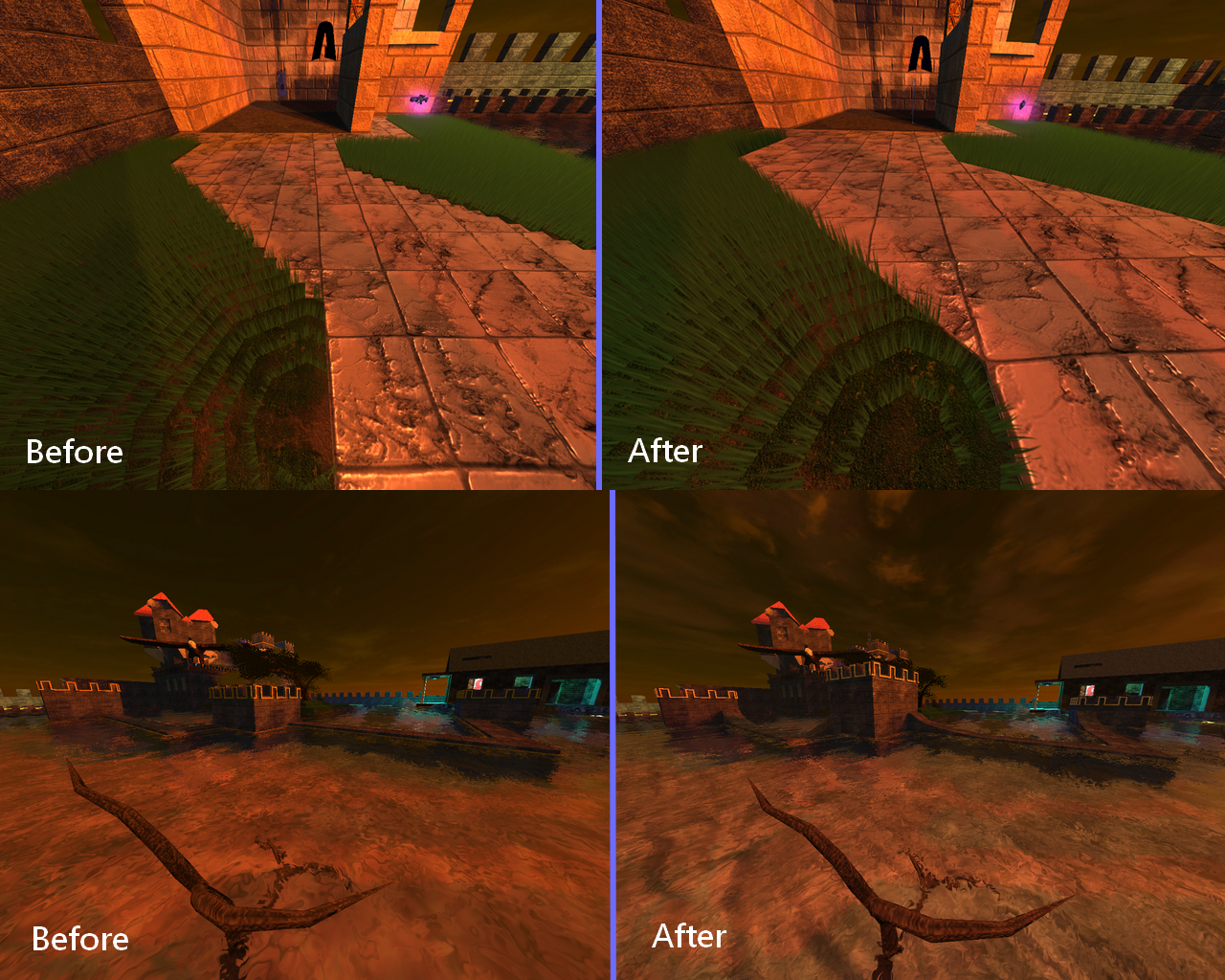 Dratz-_C {l Wrote}:Starting on the tower farthest from but not yet facing the eagle, I jump down to the walk. The moderately narrow walk makes a 90 degree turn to the right which then leads to the next tower. It is when I make this right turn on the walk that my framerate lurches. I face the complex geometry area of the map by the eagle, usually making me over shoot my turn to about 120 degrees and fall in the water to the right of the walk. I suggest altering the 90 degree turn to become two 45 degree angles to smooth out the turn into a bend. Ask me for a diagram if you need it.