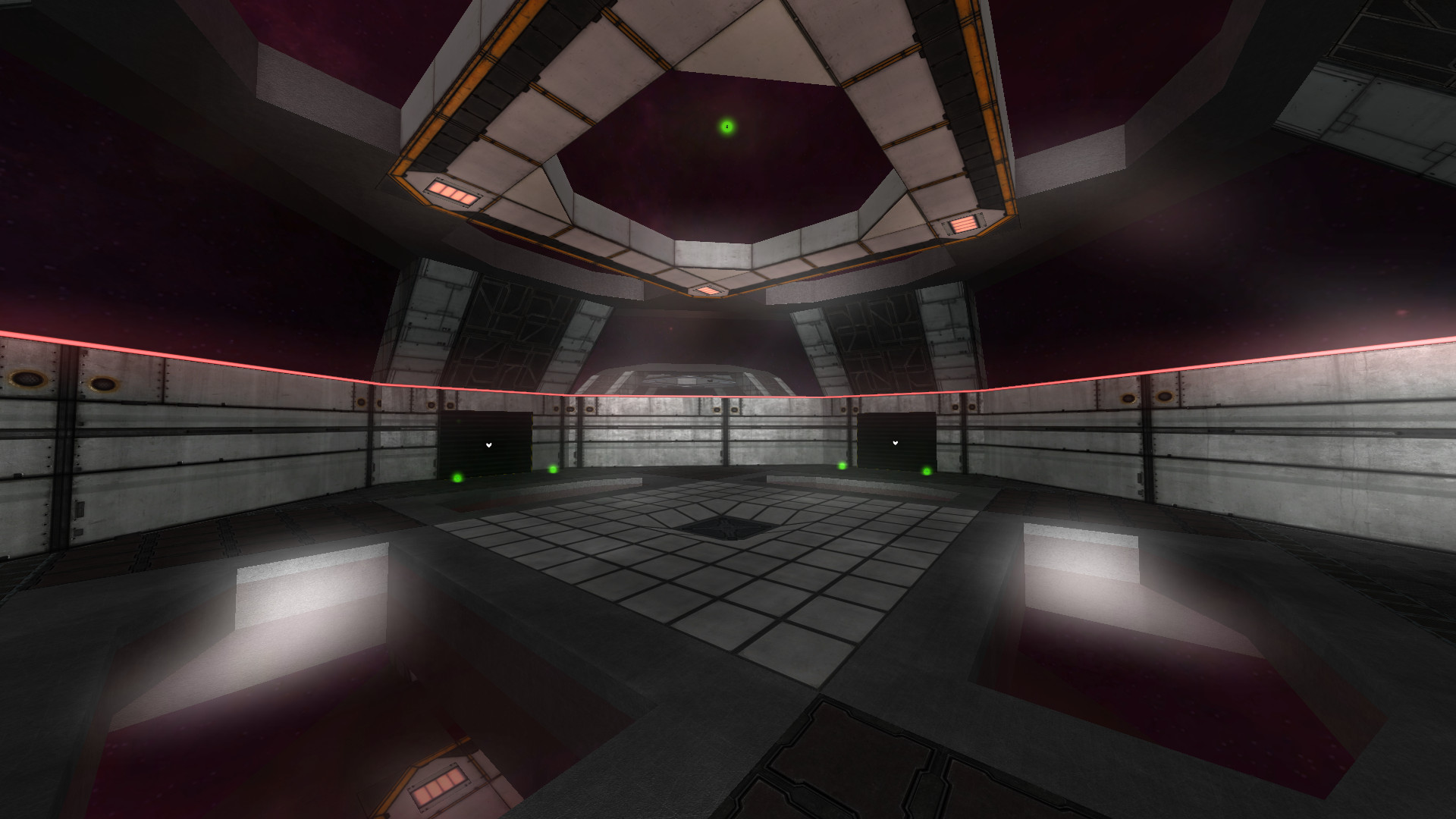 The map is suitable for 6 - 8 players. There's only gravity in the both rooms where the alpha and omega team spawns using triggers.
