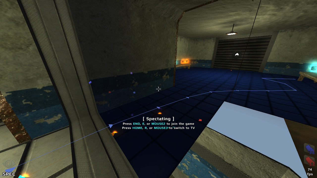 I've been playing around on this map a bit, and I still can't get the situation with the doors to the resupply room resolved to my liking. The biggest problem is AI navigation, and the inability to specifically set waypoints to only traverse in one direction whilst on the ground. I fixed this in non-team games by playing with the triggers to keep the doors open, but we still get the situation where the bots can't get into the resupply room in team games, which is where the bulk of the weapons spawn (and hence, generate a high affinity to go that way to get them).