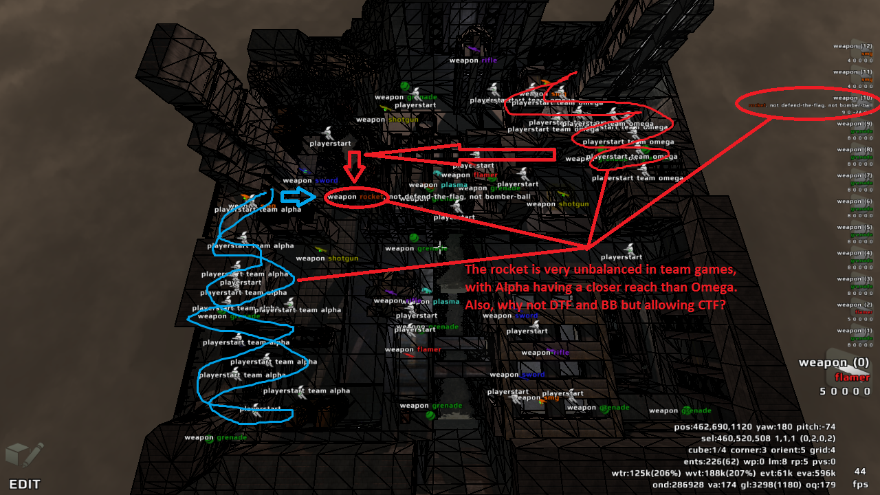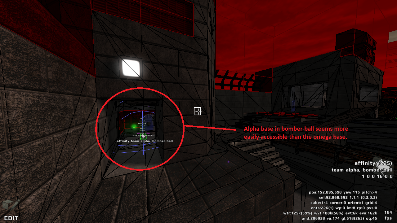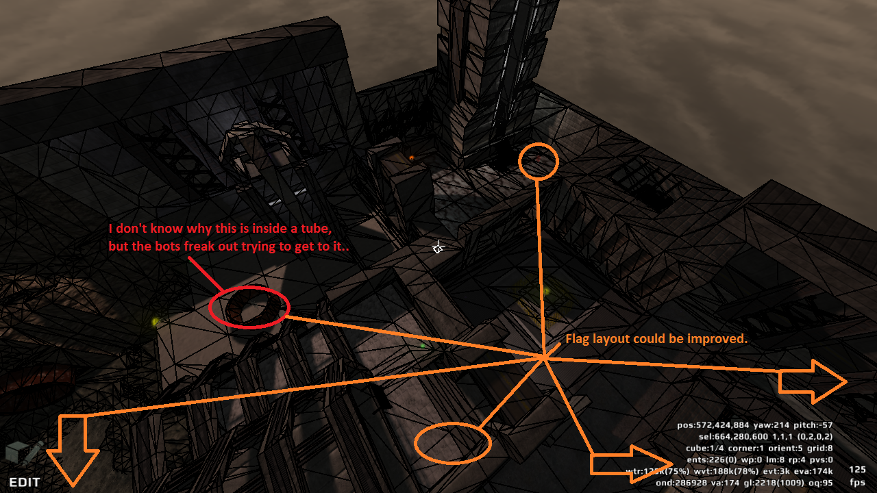 Yeah, bots will not jump in tube gladly.. , unfortunately. :) I have put it on the floor beside. About the flags.. some are also in different heights, so they seems to be (while trying to reach them from both bases) balanced for alpha and omega, but I have added one more flag in one position, more in the middle of the map, since they are placed mostly closer to sides of the map on its certain positions.