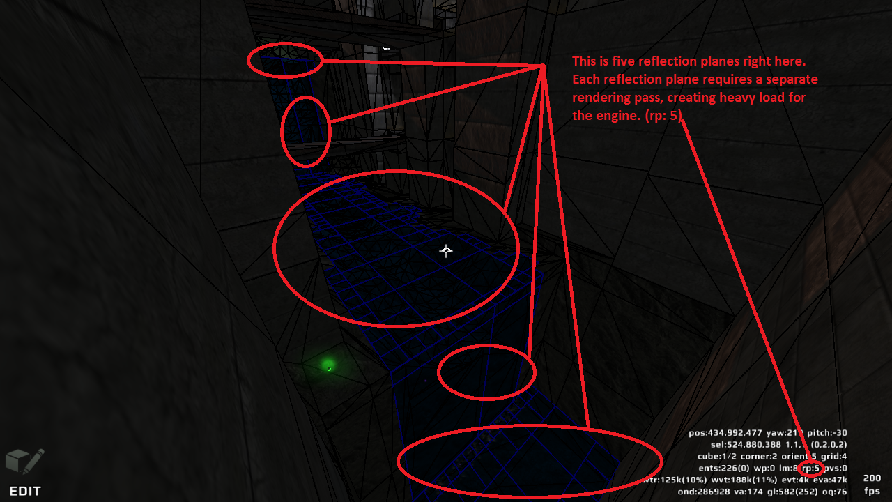 • Possibly too many reflection planes (see the "rp: X" stat in the bottom right in edit-mode).