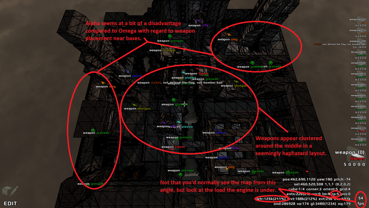 From view from side of the map is possible to see that weapons are in different heights. From bird's-eye view it looks more clustered though. But the plasma looked harder to pick up for alpha team, so I moved a bit its position and added one grenade closer to alpha, since omega had grenades a little closer.