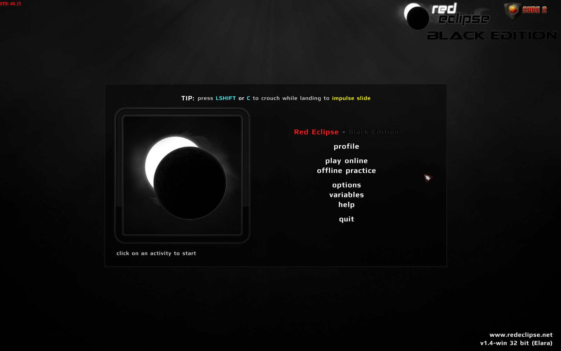 press b in game: to open the Red Eclipse - Black Edition Menu