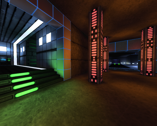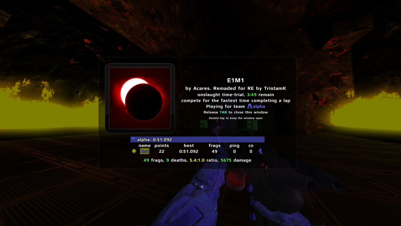 By the way, I found out that if you play the map in gauntlet-onslaught, players can pick up weapons. You can play a full-fledged SP match by adding the commands "gauntletweapon 1" and "botbalance 0" to the .cfg, and chainging the playerstarts to team alpha. (If you really want to spice things up, set /botbalance to a nonzero number and add Omega playerstarts somewhere. Team Omega is friends with the grunts in Onslaught mode, so if you want, you could have players and bots on Omega trying to stop the heroes of the SP mission.)