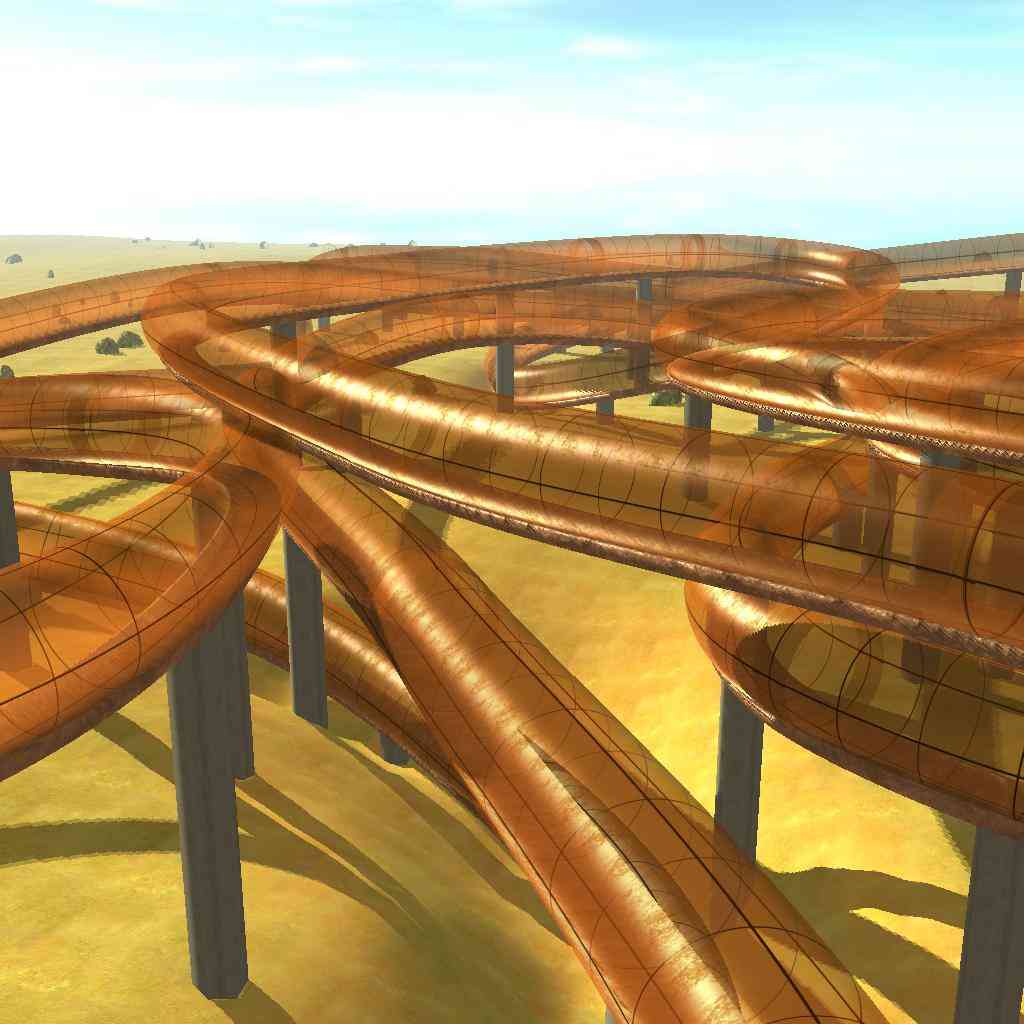 It is a long winding road completely in an orange pipe in the desert. The track is rather easy but also can be very fast if you wish it. It is also possible to drive it with an OT. I wanted to create a track where you basicly can speed almost all the time and never need to brake. The curves are all rather smooth. There is only one tilted part of the track, the rest consists of an endless up and down and easy curves.