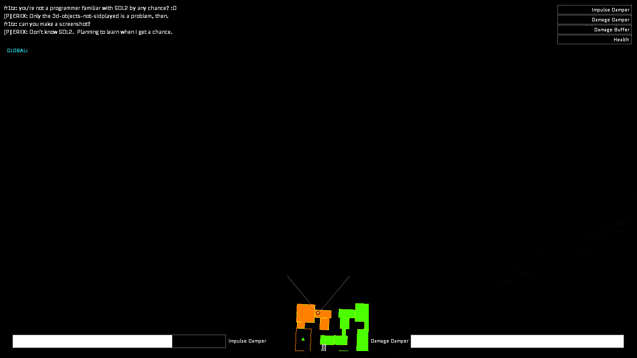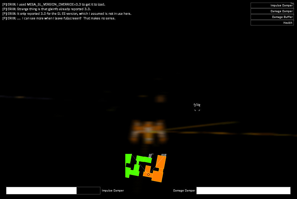 I ran again with MESA_GLX_VERSION_OVERRIDE=3.3, since that should be supported (unless we're using GL ES?). The results were rather broken, graphically. The menu worked. In fact, all 2D overlays appeared to work perfectly. The 3D was a different story. When I left fullscreen, I was able to see some effect like a vague outline, as seen in the second screenshot. I suspect it to be the grid. Returning to fullscreen largely removed it.