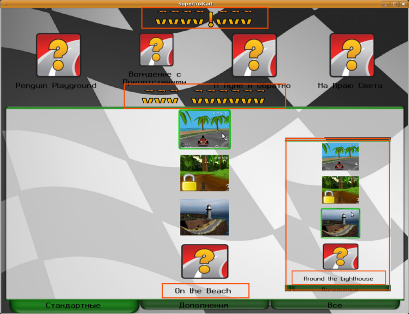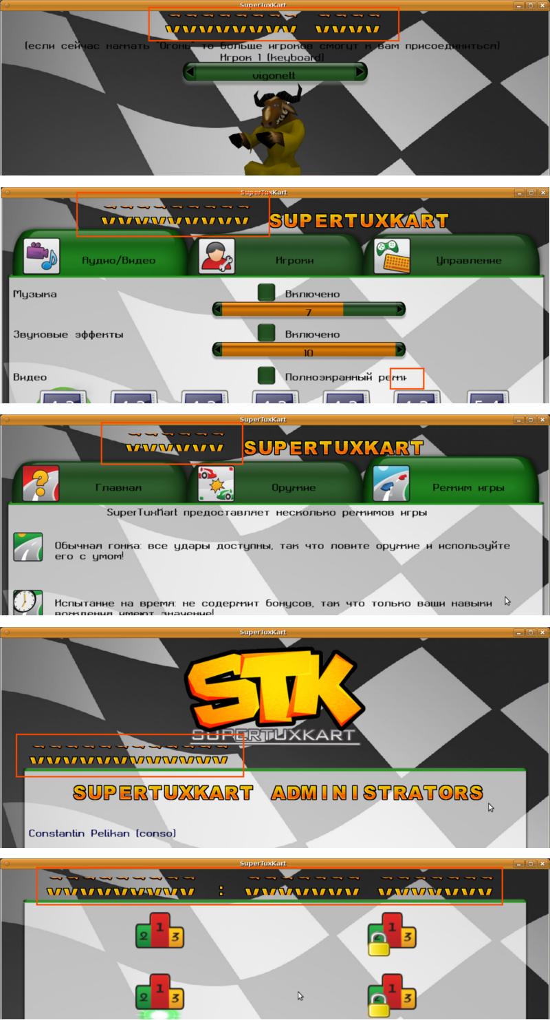 2. Headers (Choose a cart, Race setup, Challenges: Trophy room, SuperTuxKart Options, SuperTuxKart Help, Credits, Grand prix, All tracks) are looked like this crazy sharp zippers:
