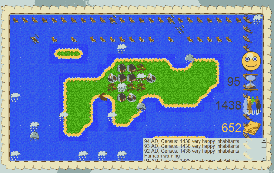 TheAncientGoat {l Wrote}:No unhappiness, no rebels, kept my population at about 50 but it kept on giving me enough money to build a couple of hospitals which caused the population to start to grow.. Still, I was able to get 300 gold and 500 population without seeing one rebel, and only losing one fishing boat to a tornado