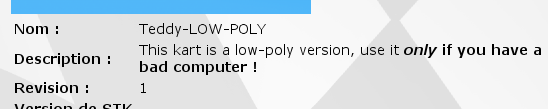 hiker {l Wrote}:One question re the version number you have for the karts/tracks: is this for the version that's used inside of stk, or a version number for the track/kart? It would be useful to have a version number for tracks/karts (perhaps call it revision to avoid using the name 'version' again), so that stk can detect when a kart/track was updated. But the internal STK version number is important, too, so that no add-ons are downloaded that won't work with the installed stk version (e.g. imagine that by stk 0.9 karts might not be compatible with 0.7 any more).