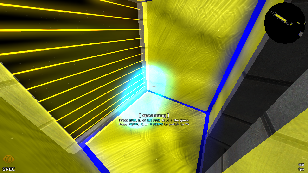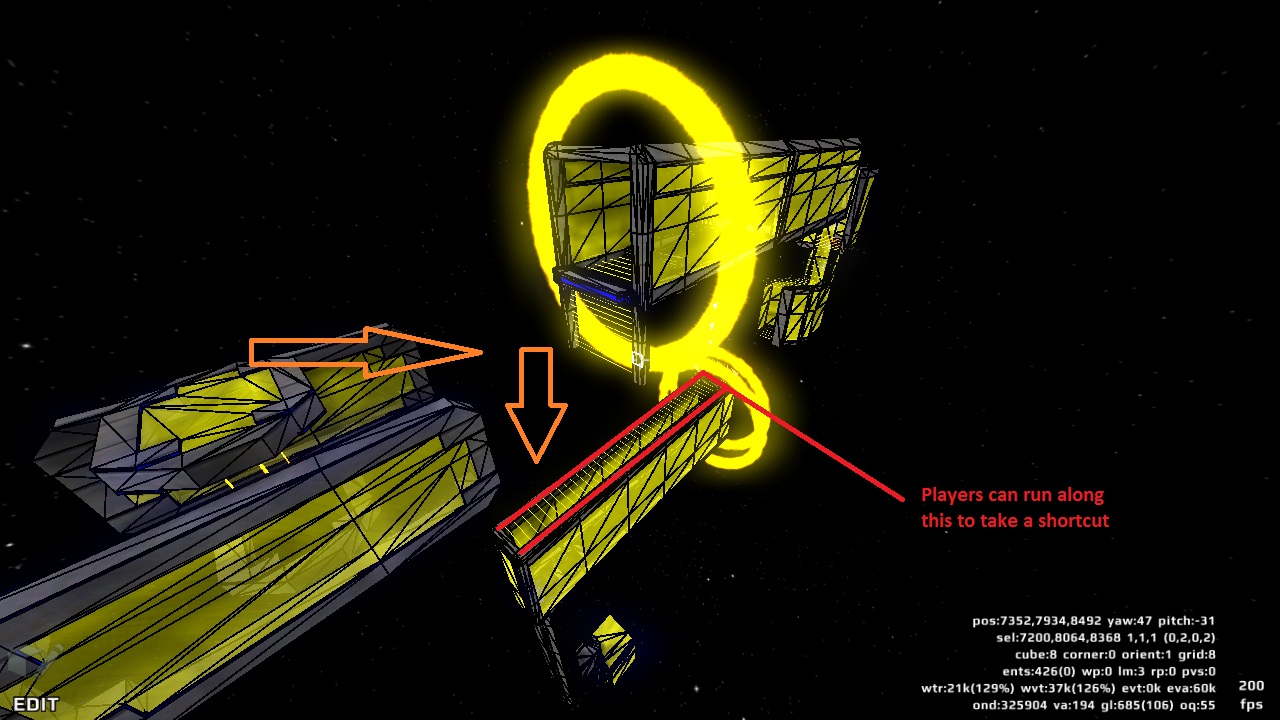 Yeah, although the shortcut through these yellow rings seems passable just with crouch. Needs a little bit more of deathmaterial at the top side and probably even small correction of the material also on the construction upside, since it's a bit beyond the lasers.