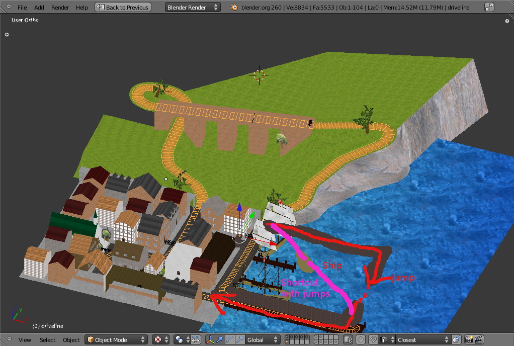 I decided to actually try out charlie's ideas here is what I cam up with. I threw this together quickly so don't worry, If people like this and I/we decide to keep it this way, I will remake/improve the grass and other parts. right now I actually really like it except for the part where you drive on the dock. with the dock part it is 1:15 long without it, it is 1:00 and the original is 0:20. the aqueduct is more like a bridge. I might change it to be longer and more aqueducty. Opinions on which version is better is greatly appreciated. :cool: :D :) ;)