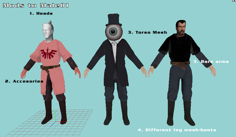 This skeleton has mainly rpg rather than fps animations, but it's not to hard to add a pistol position, a shoot animation and so forth. Once these are added and it is tested and works I will release this one. My son Tom thinks Mr Resident would look pretty cool with the RE laser or plasma shooting out the eyeball. I want to have a few variations in the torso mesh, with different clothes (T shirt, jumper, bomber jacket, suit jacket, ninja, long coat, shirtless). If you add an potentially endless number of heads, with various (game relevent accesories eg packs, belts etc) then it becomes possible to produce a lot of different models, for different genres, easily. All in a FOSSY, but blender free way. Round of applause please.