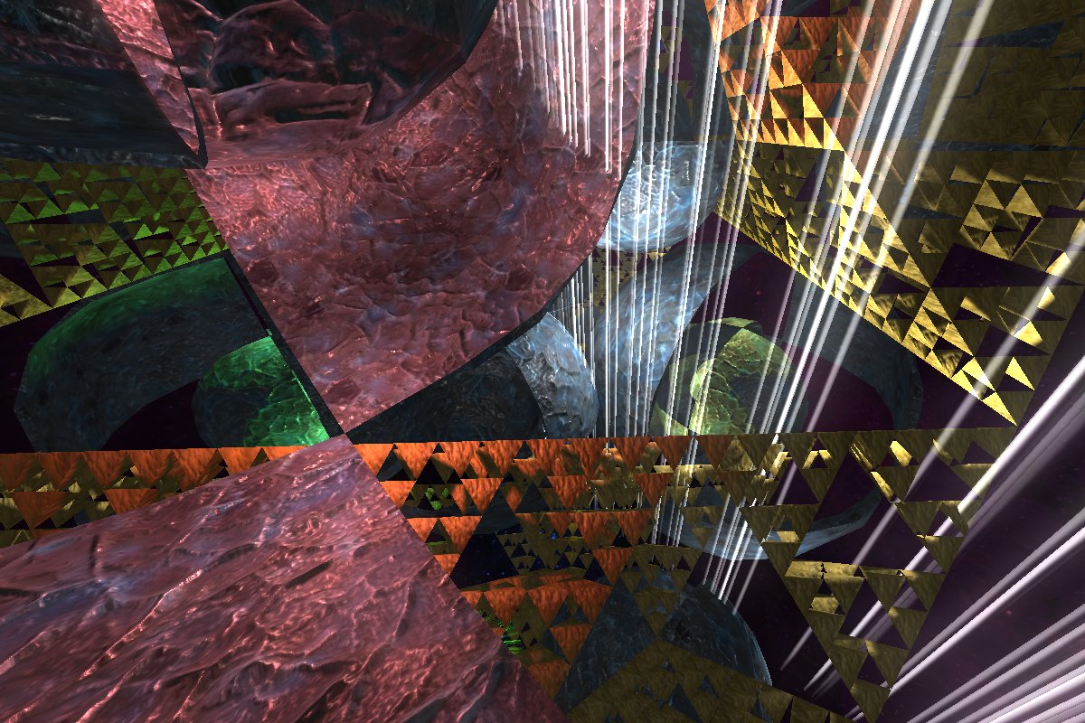 - Geometry: In this case, we have the sixth iteration of the fractal (4'096 tetrahedrons) and twenty 8-spheres placed in the empty volumes of the two coarsest grids. The larger spheres are hollow and contain the affinities.