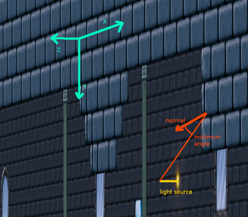 To calculate the Directional Light, for each texture (also tiles, not only Tux and enemies) a normalmap defines the normal vectors. If the normalmap is missing, the texture is simply assumed to be flat. Since supertux is 2D, light sources (e.g. a lamp) are modelled approximately as a stripe which goes in -z direction. When calculating the Directional Light for a pixel, the minimum angle between the normal (from the normalmap) and a vector to the light source (which directs to the stripe) is used. (directional light similar to Gouraud shading)