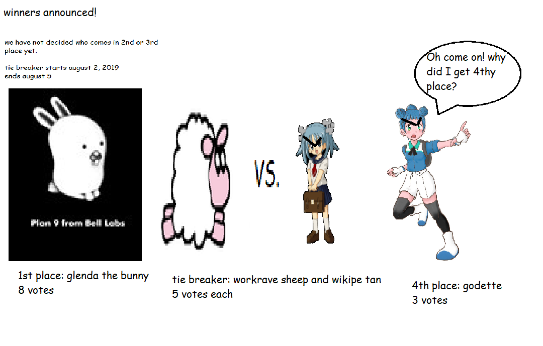 workrave sheep and wikipe tan got to the tie breaker with 5 votes for each one of them, tie breaker lasts from august 2-5, 2019. 2nd place release date: 8-6-19. 3rd place release date: 8-9-19
