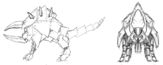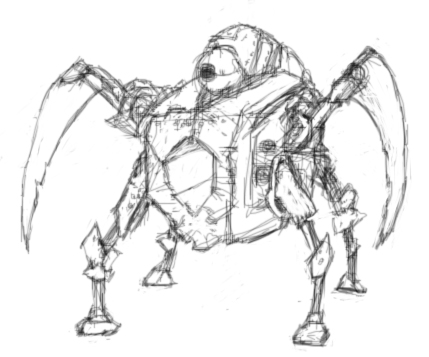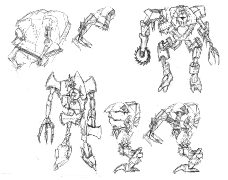 I've prepared some new sketches. First I thought a more chaotic look would be nice, but I've changed my mind and now I prefer something like sketch 7 (I call it Flea ;) (it still needs arms)). I think all constructs should be assembled out of these roundish, sharp panels like in this sketch. Also, I like the four legged constructs like sketch 3 and 5 (the Armadillo and the Crab).